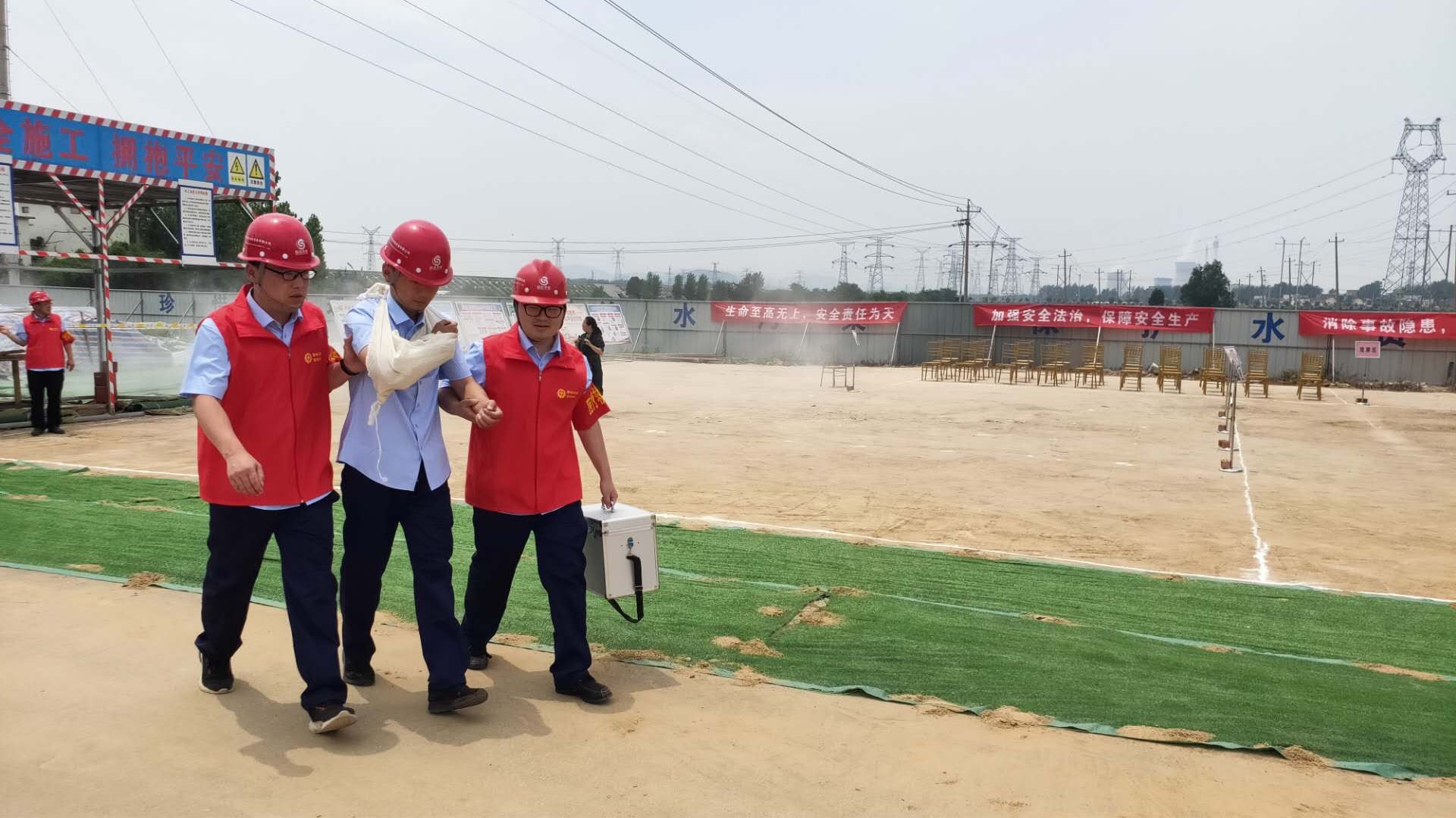 本次演練模擬事故情形為:市中區(qū)東王莊閘除險(xiǎn)加固工程施工現(xiàn)場(chǎng),模板加工廠電線線路短路引發(fā)火災(zāi),員工在實(shí)施初級(jí)滅火救援中1人不慎觸電,1人在施救時(shí)受到機(jī)械傷害,公司啟動(dòng)《棗莊市水利開發(fā)有限公司生產(chǎn)安全事故綜合應(yīng)急預(yù)案》一級(jí)響應(yīng)。成立現(xiàn)場(chǎng)指揮部,指揮各救援職能組應(yīng)急救援隊(duì)伍進(jìn)行快速、準(zhǔn)確的滅火救援,對(duì)傷者進(jìn)行CPR及止血、包扎、固定、搬運(yùn)等救護(hù)技能操作,在各救援職能組的全力配合下,圓滿完成此次應(yīng)急救援任務(wù)。